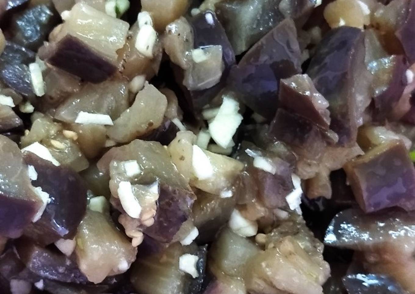 - Cortar los dientes de ajo chiquitos, agregar a las berenjenas. Salar. Rociar con aceite y vinagre en partes iguales. Mezclar bien.