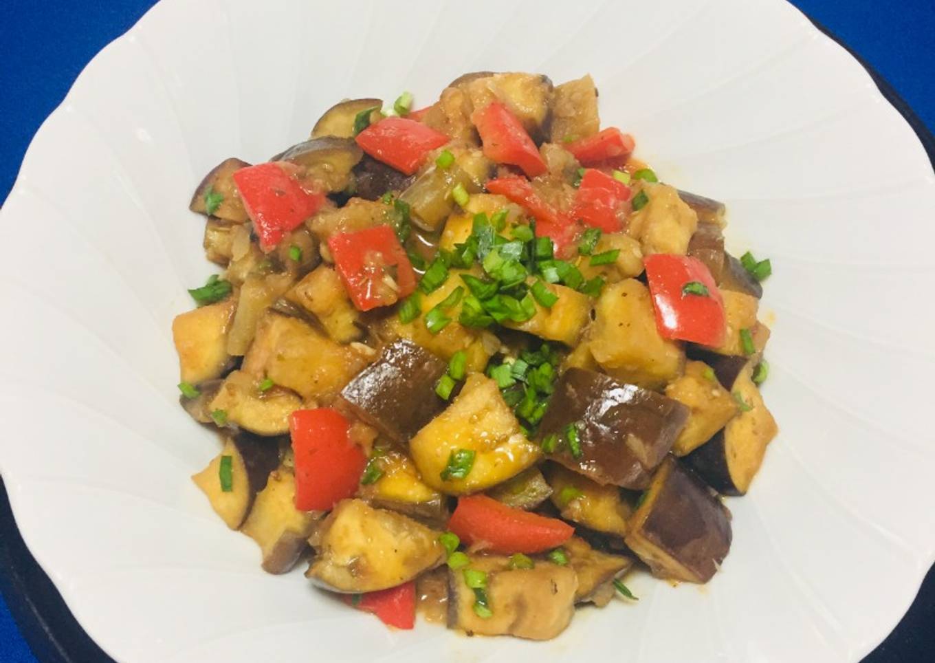 - Una vez cortadas las berenjenas mantenerlas en el agua con una gotas del jugo del limón por 3 minutos, luego escurrir y reservarlas en una olla con aceite de ajonjolí, hacemos un sofrito de ajos pasta que dore bien > agregamos los pimientos y continuar sofritando.