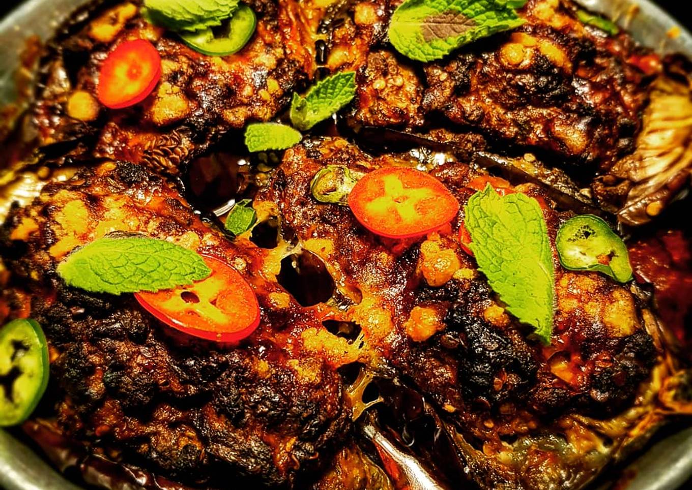 - Espolvorear sobre las berenjenas unas hojas de menta fresca y ají fresco.