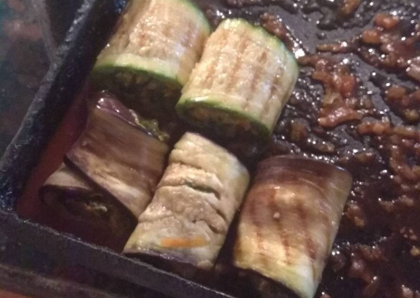 - Cocinar todo a la plancha vuelta y vuelta hasta que quede blandito (o al horno, si no les viene un huevo de gas como a mí). Si no queda blandito, no van a poder hacer los rollos y adem´ás es un asco la berenjena dura.