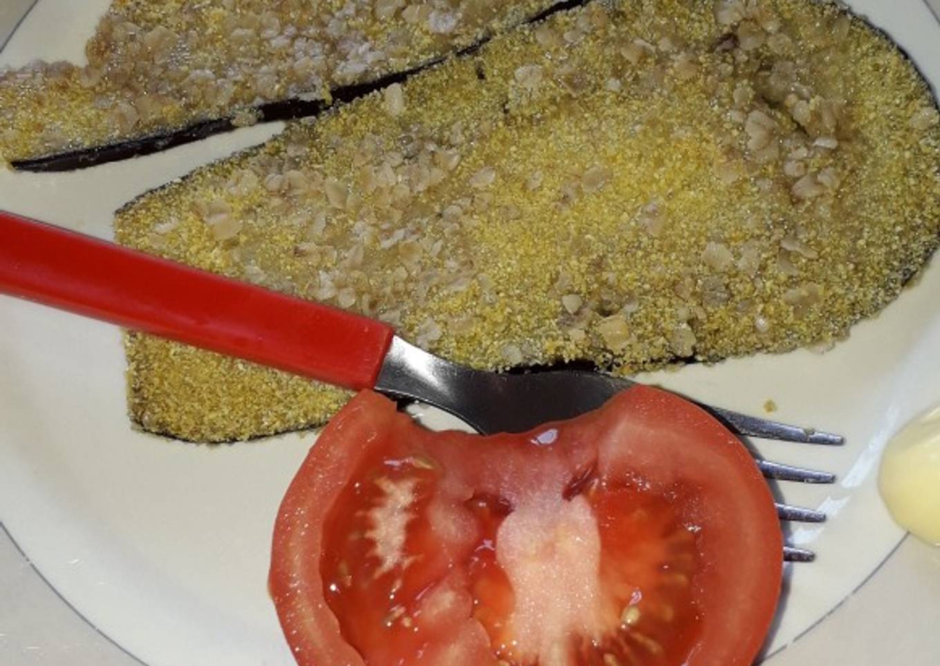 - Mezclar la polenta con la avena (reemplace el pan rallado), pasar las berenjenas por el huevo con el ají molido y provenzal, luego por la mezcla para apanarlas.