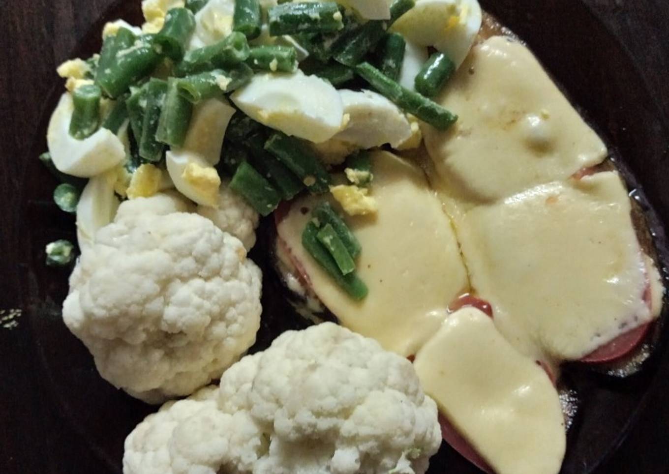 - Hervir con abundante agua en una olla:primero los huevos(esto llevará 10 min)pasado este tiempo echar la chaucha y la coliflor. Colar y servir la ensalada de huevo y chaucha, condimentarla con vinagre, sal y aceite de oliva.