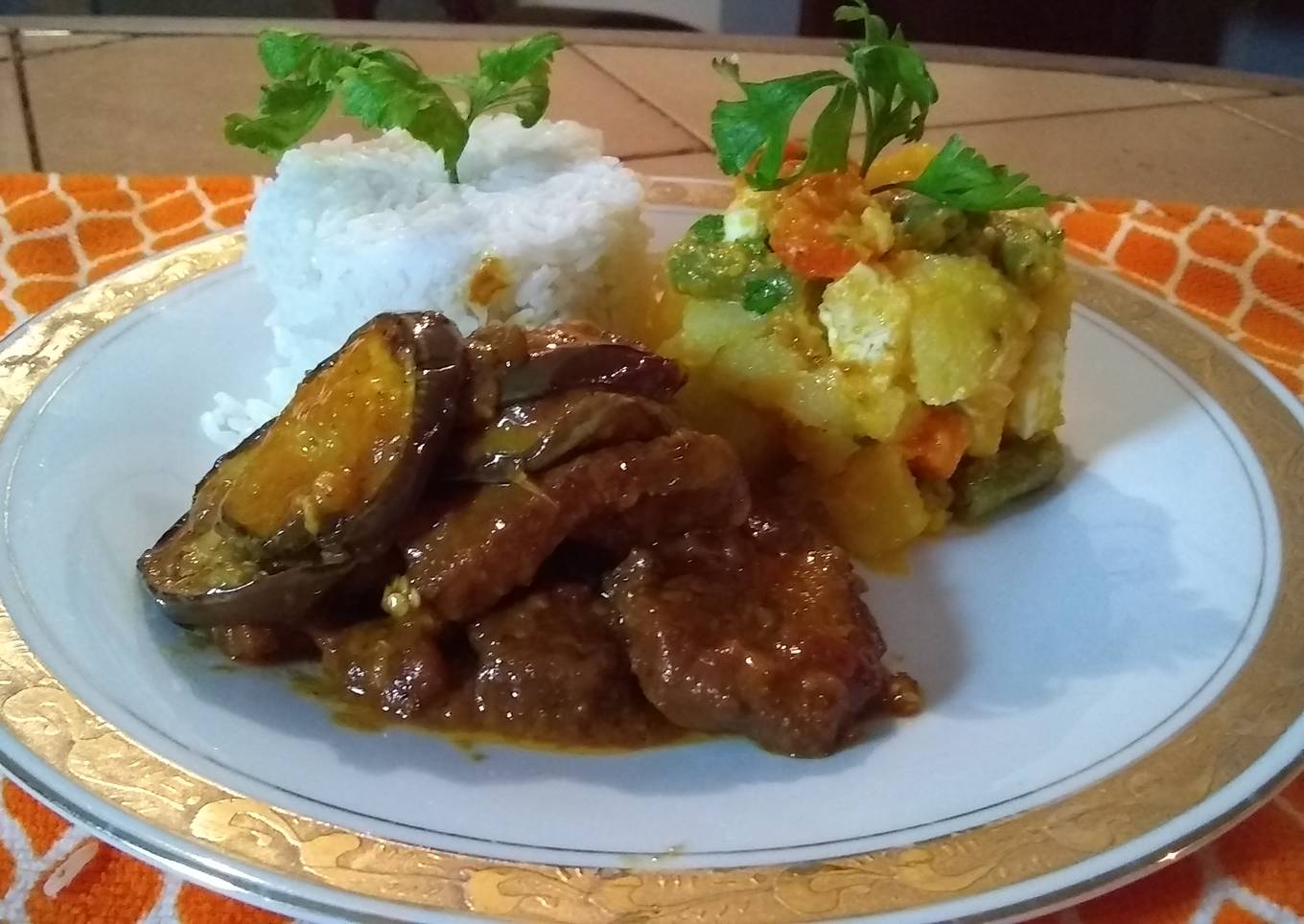 - Preparación: se lava bien el lomo con el limón 🍋 luego sazona el cerdo 🐷 con la salsa de soja y la cúrcuma se calienta el caldero se le agrega el aceite cuando caliente un poco se le agrega el azúcar y se haga un caramelo, se agrega el cerdo 🐷y se dora y se reserva en el mismo calderor se sofríen todos los aliños y parte de la berenjena 🍆 cuando todo esté bien sofrito se le agrega el cerdo y se deja guisara bien se retira el cerdo 🐷 y se licuá el guiso se cuela y se agrega el cerdo otra vez