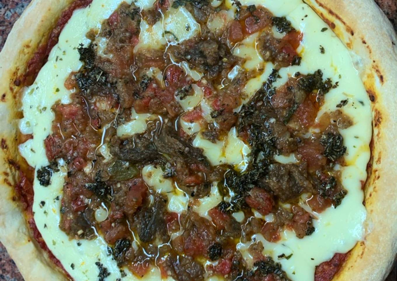 Pizza de leudado en heladera con mozzarella, tomate y berenjena