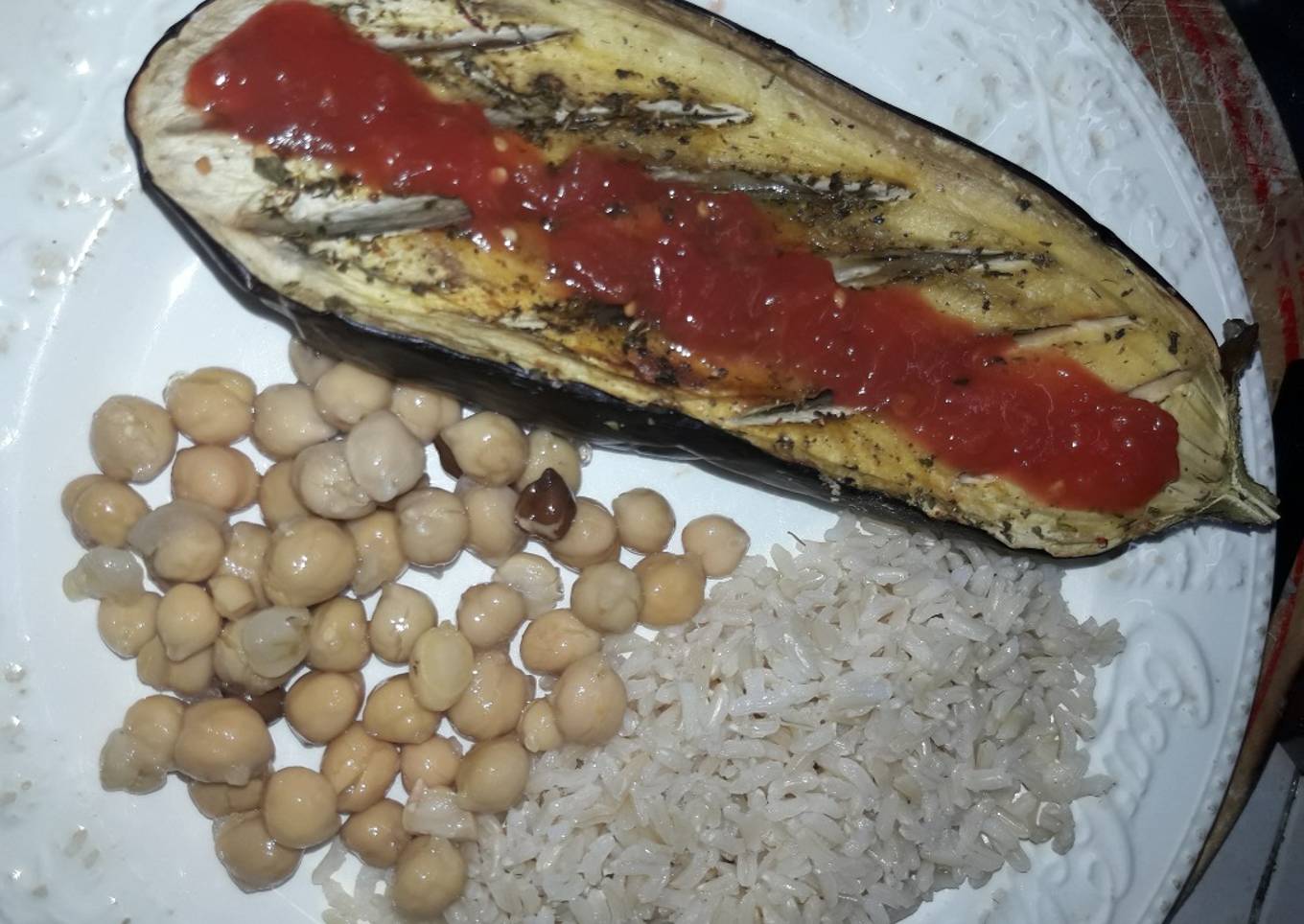 - Emplatado: Colocar una mitad de la berenjena, con unas cucharadas de garbanzos sacados de la lata y el arroz (a gusto), a mรญ me gusta ponerle un poco de salsa de tomate sobre la berenjena :)
