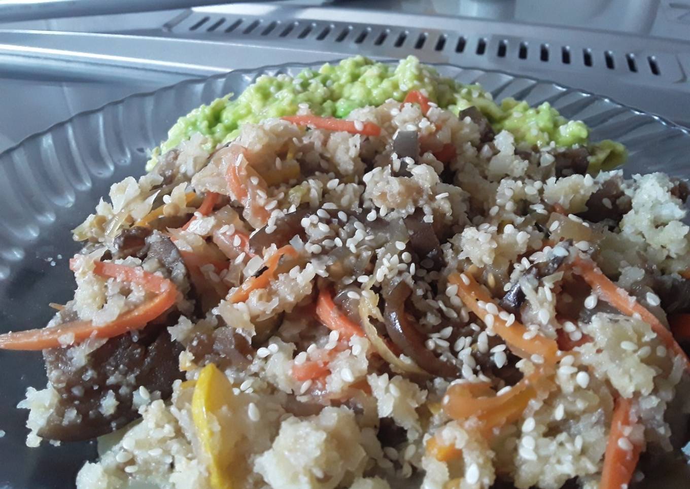 Aqu铆 les comparto un almuerzo o cena liviana de arroz de coliflor con berenjenas cebolla zanahoria y calabacines salteados en mantequilla y salsa soya!