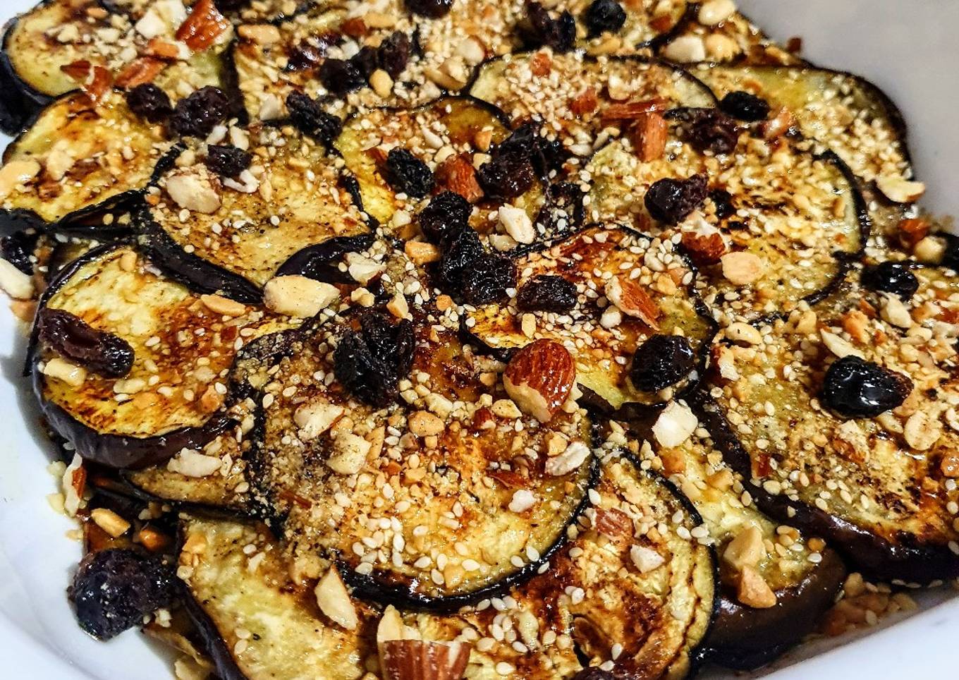 Mi niña, hoy 19 de Diciembre, de cumpleaños, ama esta receta y no podía faltar en su mesa. Berenjena asada cubierta con frutos secos a elección, en esta ocasión escogí a su gusto, almendras, maní sin sal, semillas de sésamo y uvas pasas, pueden usar arándanos, cubierta de un rico sirope, puede ser reemplazado por miel de abejas, y aceite de oliva. Acompañar con pan árabe o con baguette tipo tapitas. Les cuento el proceso, muy fácil y bastante cómodo. Vamos allá...!🌲😋