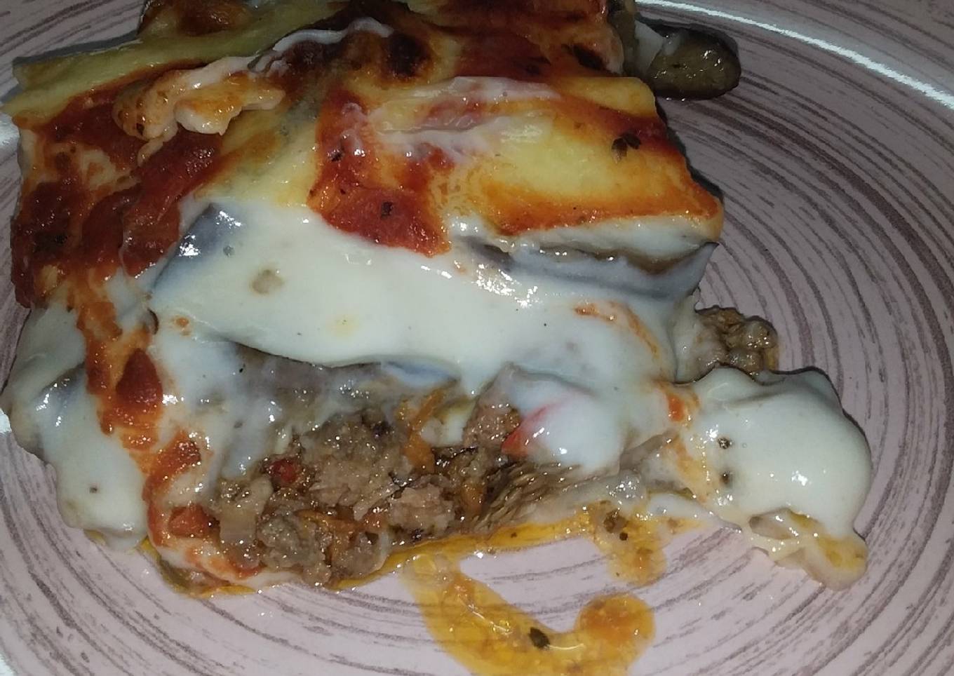- Ponemos la carne picada en una asadera ya pronta, una capa de las berenjenas, una capa del jamón, un poco de salsa blanca, las berenjenas restante, la capas de la muzarella, un poco de salsa tomate. Llevar al horno.