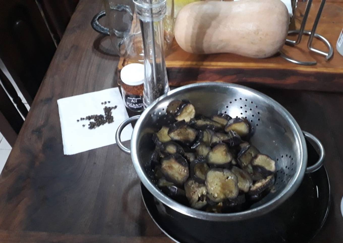 - Cortar las berenjenas en redondeles y hervir las mismas en agua vinagre dejarlas escurrir.