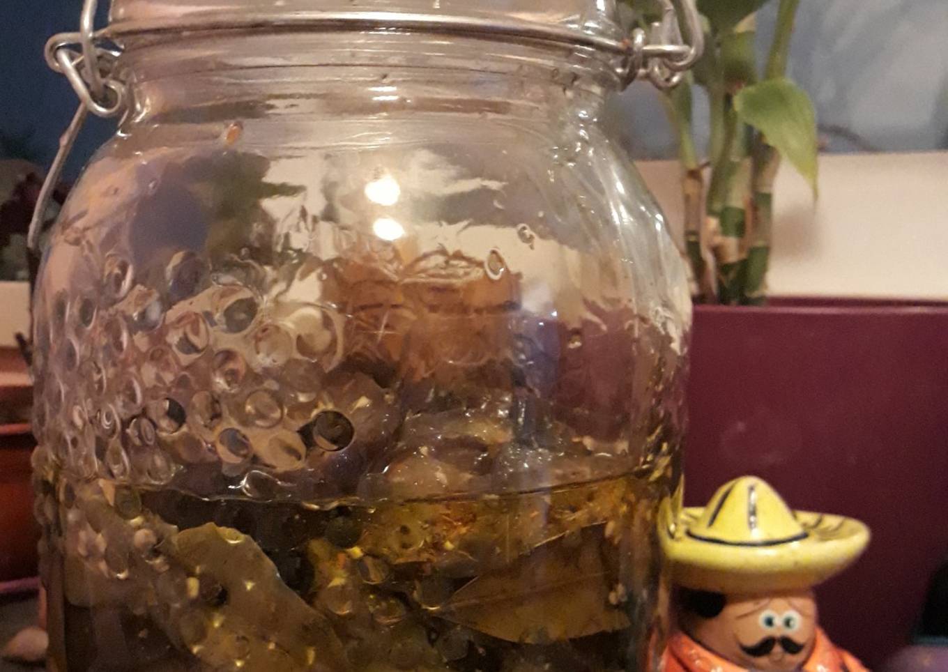 - Colar y dejar enfriar. Luego, en un frasco grande de vidrio, ir armando capas intercaladas con especias: berenjenas, provenzal, berenjenas, ají molido, berenjenas, hoja de laurel, y así hasta la última.... Luego llenar el frasco, con aceite (yo usé ambos: de maíz y de oliva) hasta cubrir las berenjenas.... y a la heladera y a aguantarse las ganas de probarlas por lo menos hasta el día siguiente!