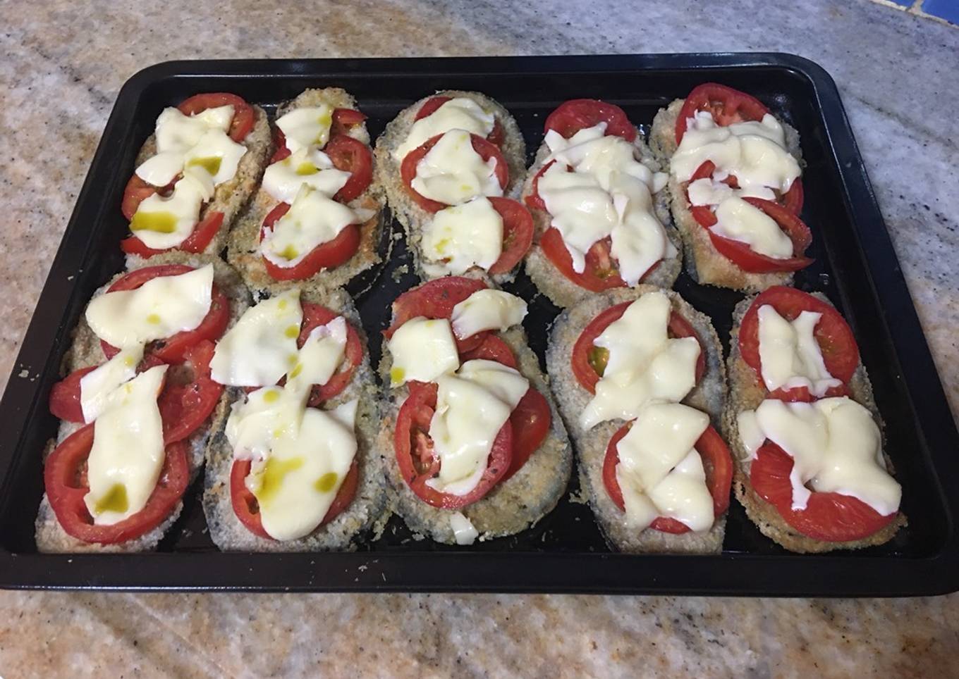 - Preparar las berenjenas en milanesa y cocinar en horno fuerte. Acomodar en placa aceitada. Colocar rodajas de tomate, sal, orégano, muzzarella y chorrito de oliva. Horno fuerte hasta derretir queso