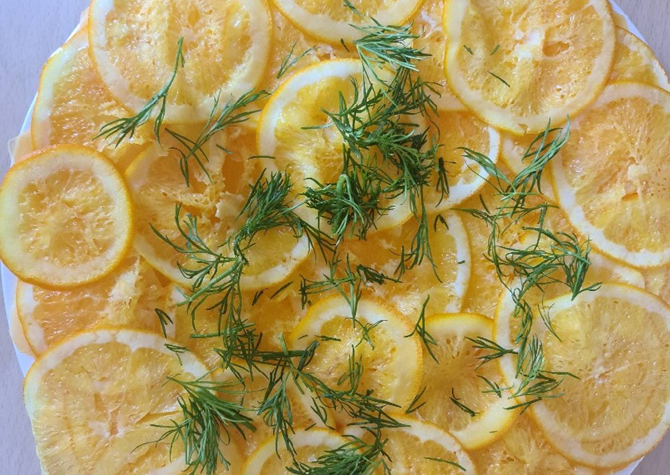 - Partir la calabaza muyyyy fina. Colocar en el plato y lo mismo con la naranja sin pelar. Añadir el eneldo y el aceite de oliva y a disfrutar. Se le puede añadir un poco de bacalao marinado o huevas de salmón.