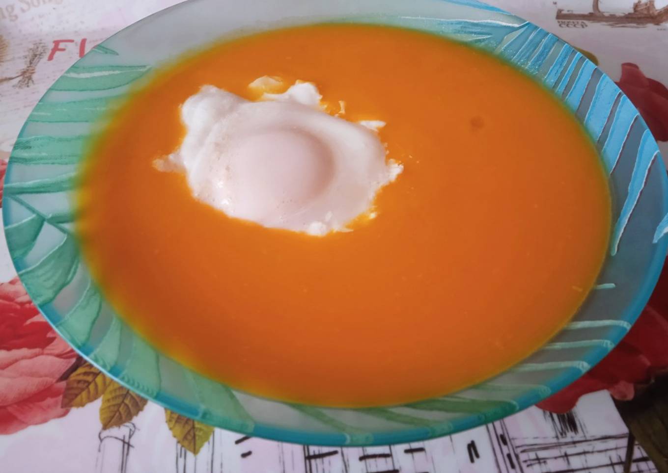 - Servir la crema de calabaza en los platos y encima de cada ración colocar un huevo escalfado.