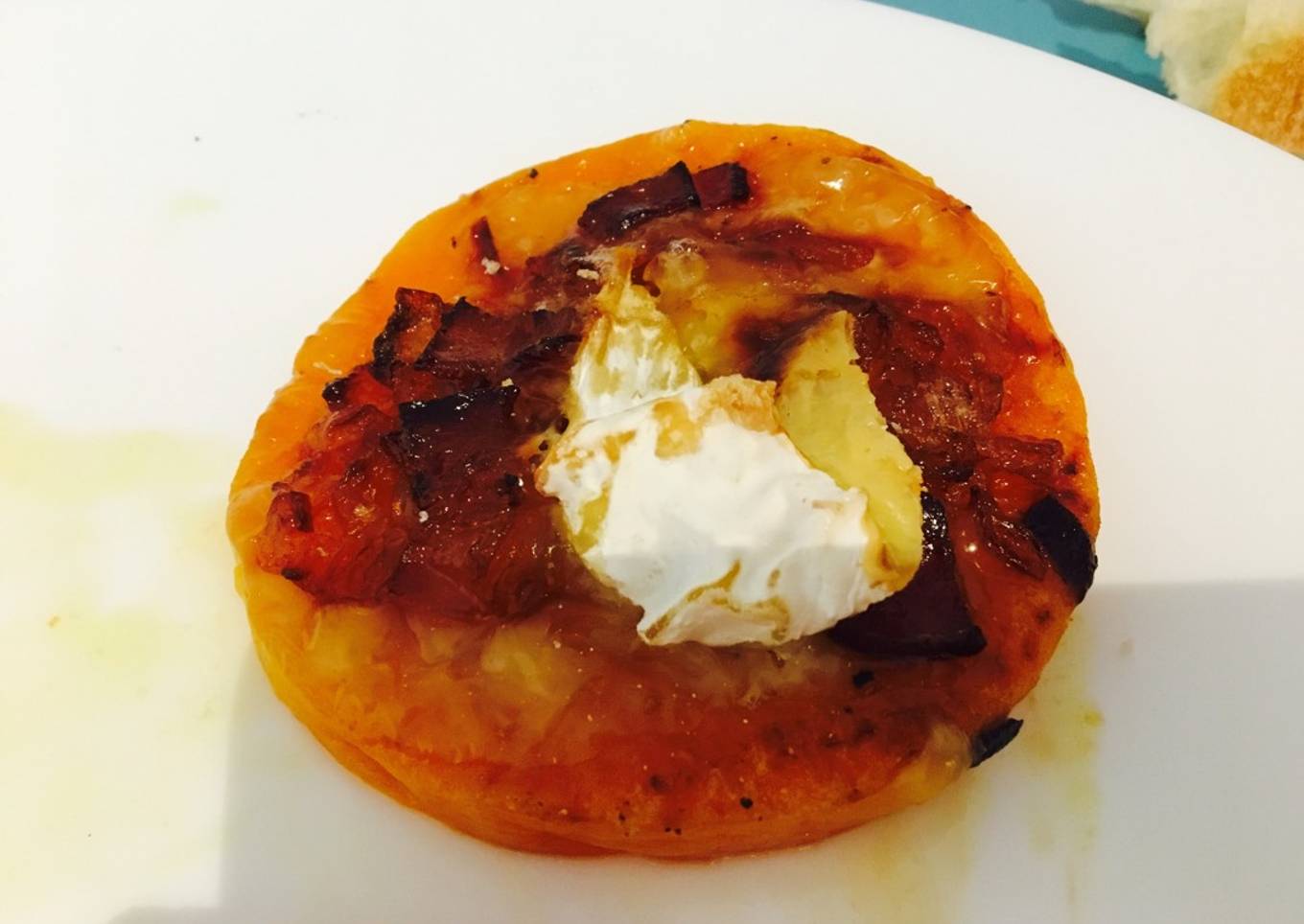 - En una bandeja de horno ponemos las rodajas de calabaza, un poco de cebolla con bacon y un trozo de queso camembert.