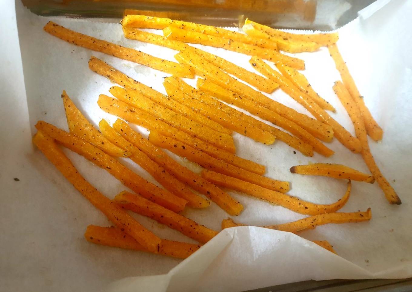 - Cortamos la calabaza a bastones y ponemos en un bol
